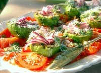 2. Se rupe salata de mână și se face câte un pat de salată pe 4 farfurii, apoi se aranjează pe câte o linie ouăle fierte, fărâmițate, baconul făcut bucăți, puiul cubulețe, avocado decojit și tăiat mărunt, roșiile decojite tăiate cubulețe mici și brânza Roquefort, astfel încât să acopere în întregime stratul de salată.