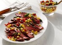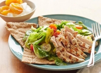 1 piept de pui dezosat și fără pieliță, sare, piper, 125 ml sos barbecue, 1 conservă mică de porumb, ulei de măsline extravirgin, 125 ml lapte bătut slab, 125 g iaurt grecesc slab, 1 linguriță zeamă de lămâie proaspăt stoarsă, 1 cățel usturoi pisat, 1 linguriță mărar, 1 linguriță pătrunjel, 1 linguriță leuștean, 1 vârf piper cayenne, 125 g amestec legume, 185 g roșii cherry, 1/2 ceapă roșie tocată mărunt, 75 g brânză rasă