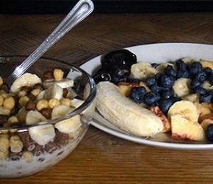 Se taie fructele cubulete.Intr-un castron se aseaza un strat de iaurt/branza, unul de fructe si asa mai departe. Deasupra se pun nucile si cerealele. Se stropeste cu suc de mere sau cu lapte degresat.