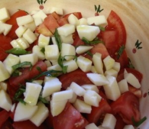 Se taie rosiile feliute mici si se rade branza. Se amesteca intr-un castron iar deasupra se toarna uleiul si otetul, dupa care se adauga busuiocul.