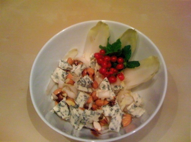 Se taie 3 andive prospete, 100 g de branza cu mucegai si se zdrobesc 30 de grame de migdale crude. Se amesteca, se condimenteaza cu putina sare, ulei de nuci, ulei de masline si se decoreaza cu coacaze proaspete si cateva picaturi de sos de rodii.