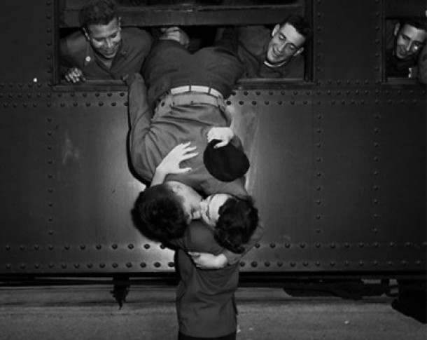 Urmatoarele trei fotografii reprezinta soldatii care isi saruta iubitele de adio, mai ales ca nu stiau daca le vor mai revedea. Imaginea cu soldatul care isi saruta iubita chiar in usa autobuzului dateaza din 1948 si a fost facuta in Seattle. O alta imagine o infatiseaza pe Marlene Dietrich in New York, in anul 1945, in timp ce este sustinuta de mai multi soldati pentru a oferi un sarut ca la carte unui "norocos". Iar fotografia in care soldatul este pe jumatate in tren si pe jumatate afara pentru a-si saruta iubita este din California si a fost realizata in 1950.