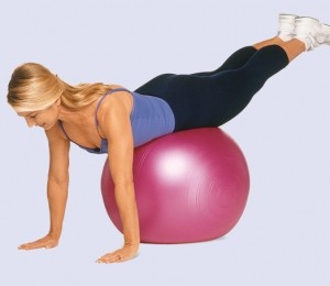 1. Întinde-te cu abdomenul pe mingea de fitness, cu partea superioară a corpului şi gâtul paralele cu podeaua. Pune-ţi mâinile la ceafă şi depărtează-ţi picioarele, la o distanţă mai mare decât lăţimea umerilor, şi fixează-le pe podea, în spatele tău.