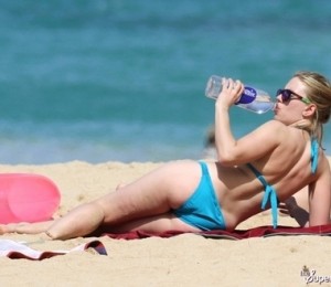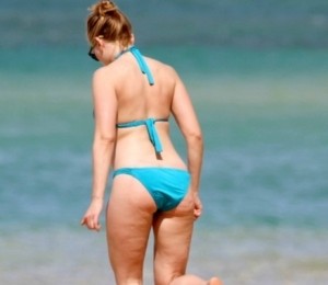 Actrita in varsta de 27 de ani poarta un costum de baie albastru din doua piese care ii lasa la vedere celulita de pe picioare. In 2010 a fost desemnata cea mai frumoasa femeie din lume, dar imaginea pe care actrita o infatiseaza in prezent nu se ridica la nivelul titlului primit.