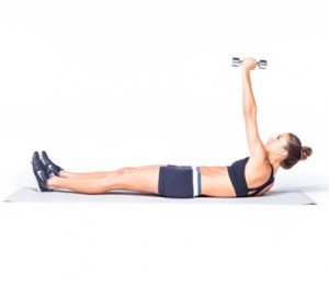 Aseaza-te pe sol, cu fata in sus si picioarele intinse. Tine cate o greutate in fiecare mana. Mentine mana dreapta intinsa pe langa corp, ridica bratul stang deasupra capului si totodata umerii si capul de pe sol. Numara pana la 3 dupa care revino in pozitia initiala. Fa cate 10 repetitii pentru fiecare mana.