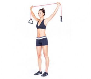 Pentru acest exercitiu vei avea nevoie de o coarda elastica. Stai in pozitie dreapta, cu picioarele usor departate si mainile pe langa corp. Tine cu ambele maini coada si ridica bratele deasupra capului tragand coarda in directii opuse. Numara pana la 5, dupa care relaxeaza si revino in pozitia initiala. Fa cate 3 seturi a cate 12 repetitii.