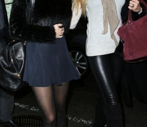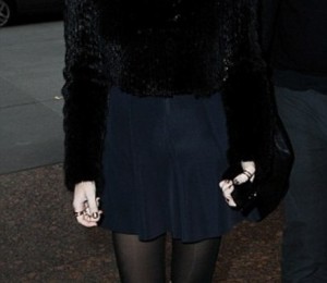 Miley a purtat un pulover negru din imitatie de blana, combinat cu o fusta din catifea albastra, dres negru si ghete fara toc.