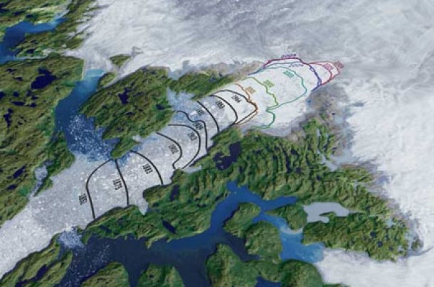 Aproape 10% din gheata pierduta de Groenlanda vine de la Jakobshavn, despre care se crede ca ar fi responsabil de cresterea nivelului apelor.
