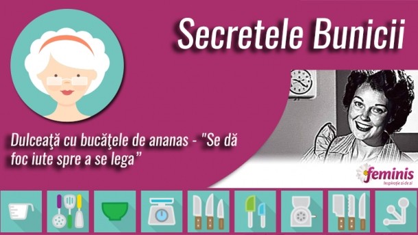 Reţeta de astăzi este pentru o dulceaţă de bucăţele de ananas şi este extrasă din cartea de bucate practică ce poartă semnatură doamnei Ecaterina Colonel Steriad. Această carte de bucate era considerată "Biblia gospodinelor" de la acea vreme.
