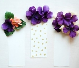 Taie cartonul in forma unui semn de carte. Coloreaza-l apoi cu cariocile, desenand fie buline, fie dungi sau chiar floricele. In partea de sus a semnului de carte lipeste cateva flori artificiale.