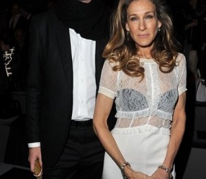 Sarah Jessica Parker a purtat o rochie alba, iar partea de sus din dantela ii lasa la vedere sutienul negru. Actrita a accesorizat rochia cu o pereche de pantofi stiletto si o pereche de manusi albe.