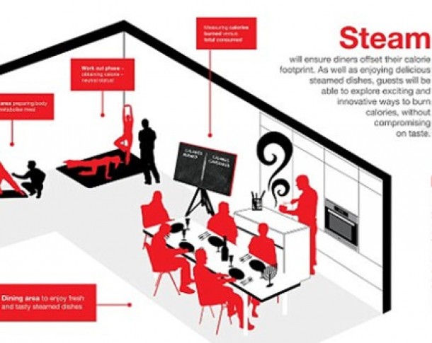 Practic, conceptul presupune ca fiecare client sa arda caloriile consumate inainte de a parasi restaurantul.