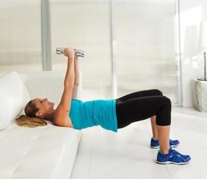Pentru acest exercitiu vei avea nevoie de doua gantere. Intinde-te pe spate pe canapea doar cu partea superioara, lasand corpul de la abdomen in jos in afara. Tine genunchii indoiti si mainile pe langa corp. Indoaie coatele si incordand muschii abdominali ridica ganterele deasupra capului. Revino apoi in pozitia initiala. Fa cate 15 repetitii.