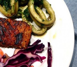 Se incalzeste uleiul intr-o tigaie dupa care se adauga usturoiul, piperul si ardeiul gras.Se amesteca bine timp de 2-3 minute. Se prajesc feliile de somon timp de un minut, pe fiecare parte.Se scurg de ulei dupa care se adauga sucul de mere.Se acopera si se coace inca 5-6 minute.