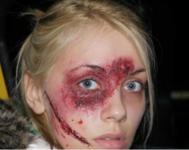 Andreea Patrascu este infatisata batuta, cu o rana la ochi si o taietura pe obraz, ca si cum ar fi fost victima unui atac violent.