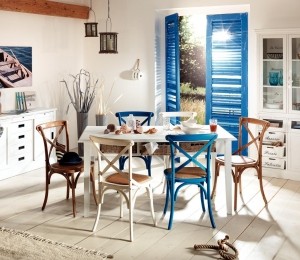 Inspirat din stilul mediteranean, mobilierul bleu va aduce frumusețea și calmul cerului albastru în locuința ta. Decorează pereții cu rame cu fotografii din vacanțe minunate, scoici, decorațiuni în stil marin, iar diningul te va duce rapid cu gândul la o casă de la malul mării.