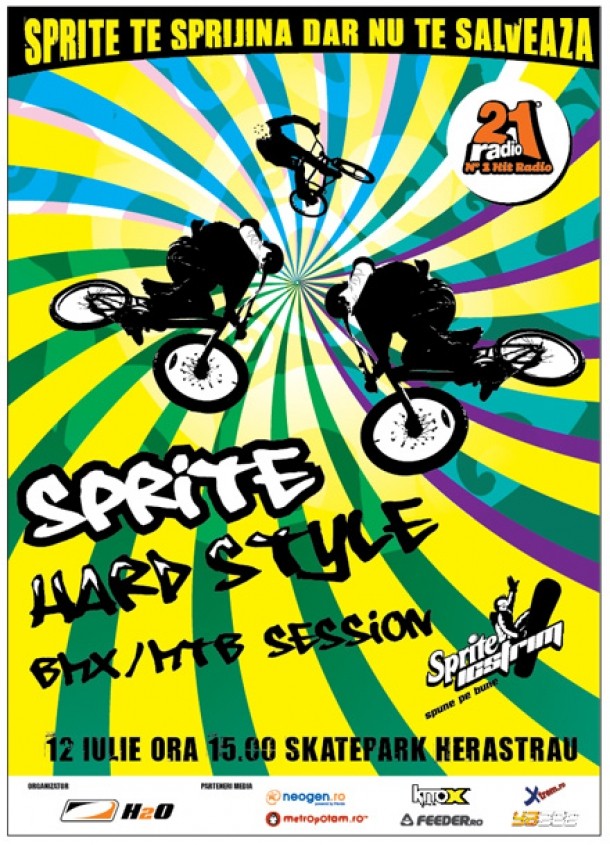 Seria concursurilor Sprite`Hardstyle continua Sambata 12 Iulie la ora 15.00 cu BMX/MTB Session. Nici miza nu este de neglijat, sunt premii de 1500 de euro, jumatate cash si jumatate produse din Magazinul H2O.