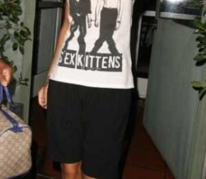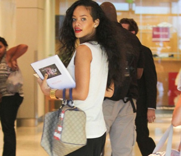 Rihanna a fost surprinsa de paparazzi iesind dintr-un restaurant din Santa Monica si multi au privit cu suspiciune outfitul abordat de artista. Parea foarte normal, lucru care nu ii prea sta in fire acesteia. Rihanna purta o pereche de pantaloni negri, pana la genunchi si un tricou casual. Nota extravaganta a tinutei a fost data insa de perechea de pantofi pe care aceasta o purta. Pantofii erau negri, cu un lant auriu pe post de curelusa si un toc care incepea tocmai de la jumatatea talpii.