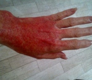 Brandi Glanville, vedeta din "The Real Housewives Of Beverly Hills", nu este la prima isprava de acest gen. Dupa ce a postat pe Twitter o fotografie cu arsurile capatate pe mana in urma unui tratament de infrumusetare, Brandi isi socheaza fanii cu o fotografie in care apare desfigurata, cu pielea rosie, arsa in urma unei interventii cu laser pentru tratarea melasmei prin depigmentarea tenului.