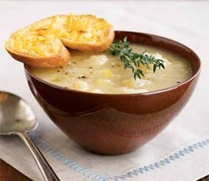 Intr-o tigaie se caleste ceapa in ulei de masline. Se adauga supa de pui si se lasa la foc mediu cateva minute, cu vasul acoperit. Cand ceapa devine moale, se scurge si se paseaza bine. Se adauaga restul de supa intr-o oala impreuna cu vinul, condimentele si inca 500 mililitri apa. Cand incepe sa dea in clocot se adauga smantana si apoi cozile de ceapa verde, tocate marunt. Se lasa pana incepe sa fiarba. Se pune in farfurii si se adauga crutoanele. Se serveste cu verdeturi tocate, cu cascaval ras deasupra si cu putina zeama de lamaie.