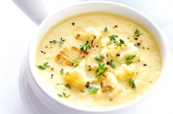Pune supa în boluri și ornează cu puțin ulei de măsline, cimbru și buchețele de conopidă.