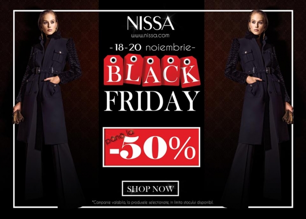 Black Friday este un eveniment care se lasa indelung asteptat si, conform traditiei comerciale, discounturile sunt valabile o singura zi, aceasta fiind cea de 18 noiembrie. La NISSA, insa, le oferim clientelor posibilitatea de a face cumparaturi tot weekendul, timp de trei zile, astfel ca vom transforma Black Friday intr-o sarbatoare a stilului. De la rochii, camasi, bluze si pantaloni casual si office pana la tinute elegante, incaltaminte si accesorii, sute de produse vor astepta sa fie adaugate in cosul de cumparaturi al clientelor.