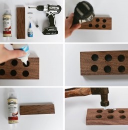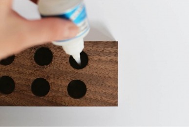 Odată ce ai dat toate găurile, pune super glue în ele şi bagă fiecare magnet în fiecare gaură. Lasă magneţii să se lipească bine de lemn pentru o vreme.