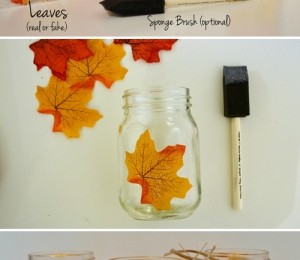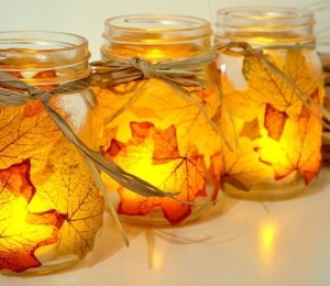 Prima noastră sugestie este borcanul cu frunze. Ai nevoie de frunze uscate galbene şi portocalii, pănuşi uscat, lipici şi un borcan curat de 800 de grame. Lipeşte frunzele de borcan, bagă o lumânare în interior, aprinde-o şi finalizează prin prinderea unei foi de pănuşă la gura borcanului.
