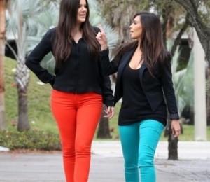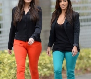 Acelasi tipar a fost urmat si de Khloe, insa aceasta a optat mai degraba pentru o pereche de pantaloni intr-o nuanta aprinsa de portocaliu.