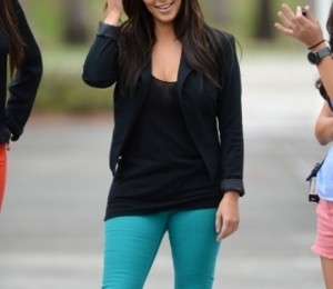 Kim a optat pentru o pereche de pantaloni in nuanta teal intens, un top negru si un sacou lejer, de aceeasi culoare. Astfel, a reusit sa distraga atentia privitorului de la eventualele imperfectiuni, mascand soldurile late. Contrastul dintre negru si culoarea puternica a pantalonilor ofera iluzia unei siluete slabe.