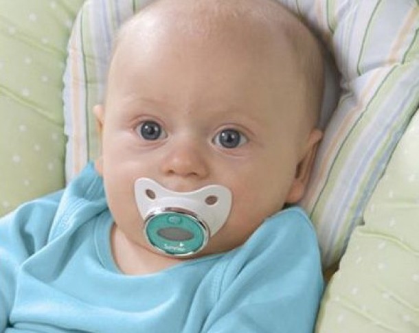 Aceasta suzeta-gadget se numeste Pacifier Thermometer este dotata cu senzori in tetina, care identifica temperatura corpului micutului si apoi o indica digital pe partea din plastic a suzetei.
