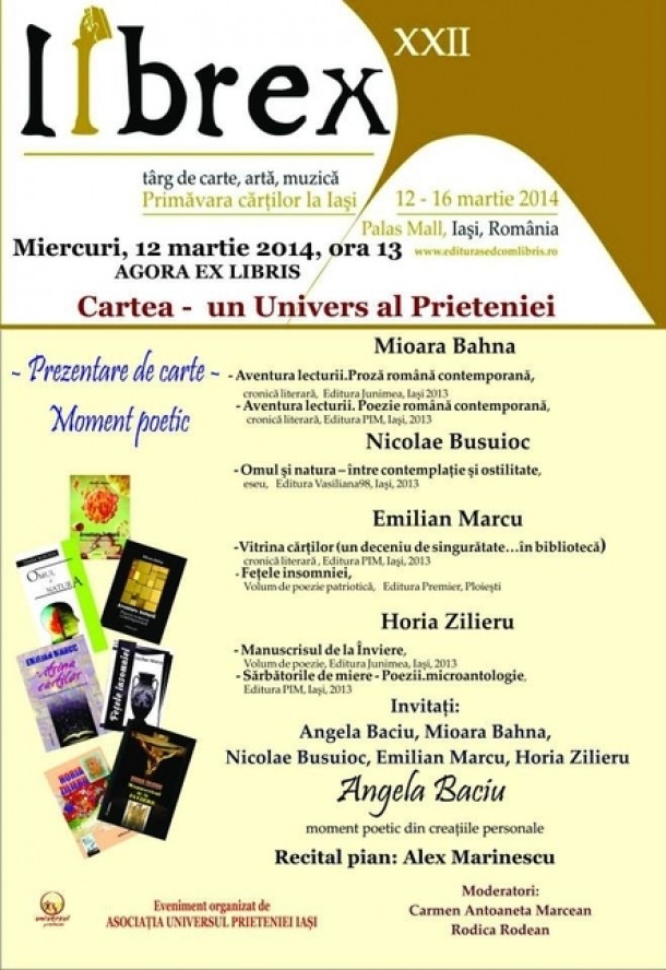 Targul Librex 2014 a fost o adevarata sarbatoare a cuvantului si prieteniei. As dori sa felicit organizatorii si partenerii, gazdele si sponsorii, partenerii media si voluntarii pentru tot ce au facut, multumesc colegilor mei din Uniunea Scriitorilor din Romania – Filiala Iasi, Muzeul ui Literaturii Romane Iasi, Asociatiei “Universul Prieteniei”, secretariatului Librex si tuturor celor ce au putut participa la Targul Librex. Ne revedem in 2015.