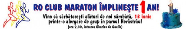 Sambata, 13 iunie 2009, membrii Ro Club Maraton, alaturi de partenerii sai, revista Ce se intampla, doctore? si reteaua de farmacii HelpNet, te asteapta in Parcul Herastrau, pentru a alerga impreuna, sarbatorind astfel bucuria miscarii si 1 an de existenta a clubului.