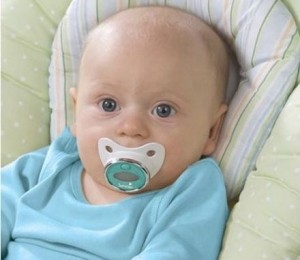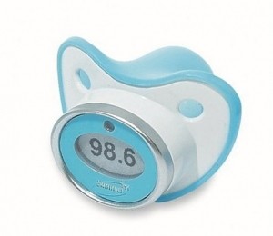 Aceasta suzeta-gadget se numeste Pacifier Thermometer este dotata cu senzori in tetina, care identifica temperatura corpului micutului si apoi o indica digital pe partea din plastic a suzetei.
