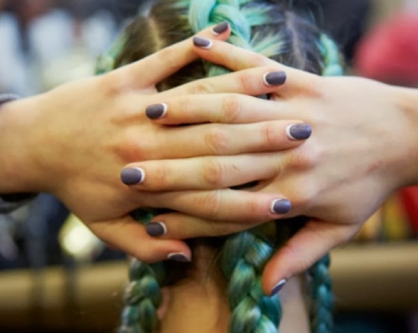 French inversat - DKNY a ales o manichiura de inspiratie urbana, un french inversat realizat in combinatii de culori precum mov-bej.