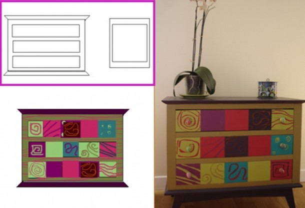 Va trebui sa alegi intre a picta sau nu un motiv dupa ce aplici culorile de fundal. De ce? In cazul in care comoda va fi asezata pe un perete care are deja un desen sau un tapet desenat, atunci regulile esteticii te vor obliga sa optezi pentru o pictura uni pe comoda, cu sau fara efecte de material (sertare vopsite intr-o alta culoare decat cadrul, de exemplu). In schimb, daca peretele are o singura culoare, atunci ai libertatea, dar nu si obligatia, sa desenezi pe comoda orice motive doresti: geometric, floral, personaje fantastice. Daca nu va puteti decide, incearca cu o moneda.
