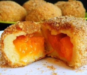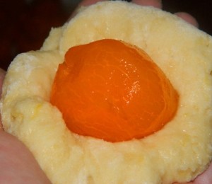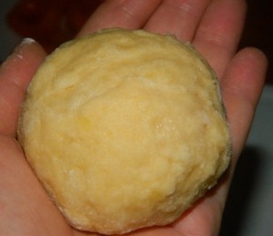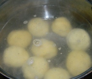 Fierbe cartofii in coaja, curata-i si lasa-i putin la racit. Piseaza-i cu o furculita, adauga oul, faina si framanta bine. Lucreaza repede cu aluatul ca sa nu se inmoaie. Rupe bucati din aluat, fa-le de marimea parmei, pune caisa si inchide-o in palma, modeleaz-o, iar in cazul in care se lipeste aluatul de maini, foloseste putina faina.