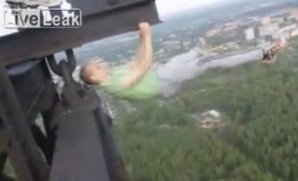 Fara vreun sistem de protectie, pe un vant foarte puternic, niste tineri baieti s-au filmat in timp ce se aflau pe barele si marginea unei cladiri si faceau acrobatii si exercitii fizice.