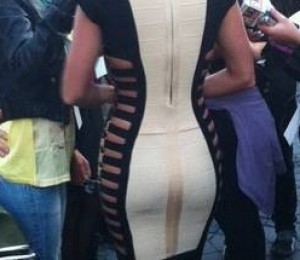 Frumoasa blonda a purtat o rochie stil sirena, crem in fata si neagra in laterale. Rochia era insa decupata indraznet in parti, lasandu-i la vedere pielea si in acelasi timp dezvaluind faptul ca aceasta nu purta lenjerie intima.