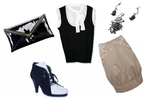 Pentru un look office-smart trebuie sa iti achizitionezi o camasa cu vesta ca cea de la Debenhams, pe care s-o completezi cu o fusta crem “gogosar”, cu buzunare laterale, de la Tara Fashion. Accesoriile black&white; o pereche de botine “Hot N Cold” de la Papucei.ro, un plic red Herring de la Debenhams si un set format din cercei si brosa din onix si marcasite de la Sheba. Wow!