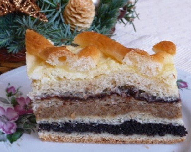 Intr-o tava, se intinde prima bucata de aluat. Se pun pe foc intr-o oala si se amesteca timp de doua minute nucile, zaharul pudra si esenta de vanilie. Compozitia se adauga peste aluatul care va forma primul strat al tortului. Deasupra se intinde cea de-a doua bucata de aluat urmand sa fie unsa cu compozitia obtinuta amestecand mac, zahar pudra, scortisoara si coaja de lamaie.
