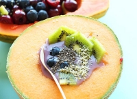 1/4 cană ulei de cocos, 1/2 lingură esență de vanilie, 1 cană afine, 1 cană căpșuni congelate, 1 cană lapte de cocos, 1 cană alune, 1 cană curmale, 2 căni caju, 2 banane, 10 căpșuni proaspete, lapte de capră