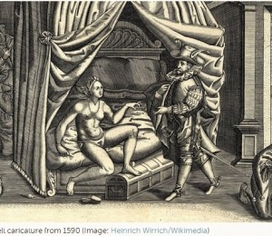 Soţia sa era reprezentată de cele mai multe ori parţial goală, purtând lenjerie intimă de metal. Dar undeva în această imagine, amantul ei era deja nerăbdător, aşteptând ca soţul să plece, având în mână o copie a cheii de la centura de castitate. Sursa.