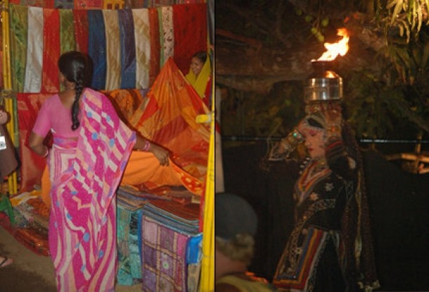 Ce faci seara in Goa o sa va dau suprema reteta ca sa incantam chiar sau aproape toate simturile. Ca sa intram in atmosfera “make love not war” mergem la Arpura un satuc faimos pentru targul sau, in sezon se tine de 2 ori pe saptamana. Poate cu ajutorul pozelor sa intelegi nebunia de culori a acestui eveniment. Nu e un simplu targ e un eveniment, intotdeauna cu ceva entertainment, eu am prins un spectacol cu o dansatoare care s-ar fi certat rau de tot cu pompierii nostri. Avea pe cap un vas in care ardeau carbuni cred si ea facea tot felul de exhibitii de si Nadia Comaneci ar fi fost invidoasa. O formatie canta la tot felul de instrumente tipice tabla un fel de tobe si tanpura un fel de sitar mai simplu si ce imi place mie cel putin vizual vorbind este harmonium. Un fel de jumatate de acordeon care se tine pe podea si cantaretul cu o mana atinge clapele ca de pian si cu cealalta pompeaza aer in aparat. E fascinant de urmarit mai ales ca in aceea seara canta o mare vedeta care era si solist vocal ba pe deasupra si un fel de Michael Jackson si nu ma refer nici la operatii sau acuzatiile de pedofilie ci la faptul ca omul nostru si dansa daca se poate spune asa ceva despre cineva care sede pe jos si mai face si celelalte chestii mai sus numite.