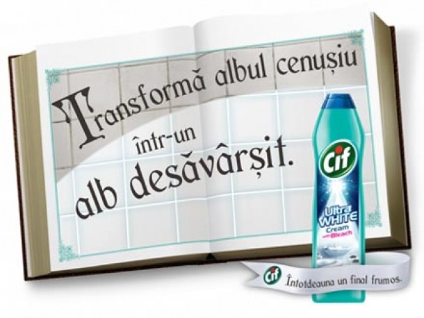 Simt ca cedez. Ma asez pe scaun si ma uit in gol pe faianta pictata. Imi cobor privirea si vad sticla de Cif Ultra White in colt. "White"- asa erau si peretii bucatariei acum cateva minute. Ma ridic si decid sa salvez totul in ultima secunda. Folosesc Cif Ultra White si observ multumita ca nu trebuie sa frec ca o maniaca suprafa faiantei, caci totul devine alb cu usurinta. Ma uit in stanga, in dreapta si in spate sa vad unde s-a ascuns Harry Potter. Misiune indeplinita in mai putin de 10 minute.