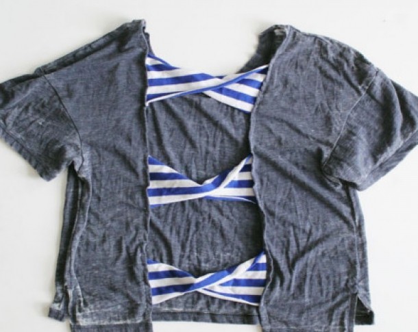 Decupeaza tot spatele tricoului, apoi coase, una cate una, fasiile de material, rasucindu-le la jumatate.
