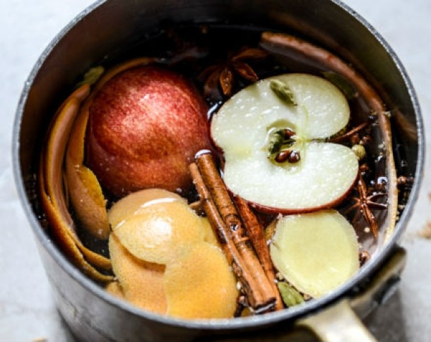 Ai nevoie de: un mar taiat pe jumatate, 2-3 batoane de scortisoara, coaja de la doua portocale, 1 lingurita de ghimbir, 10 cuisoare si 5 cani de apa.