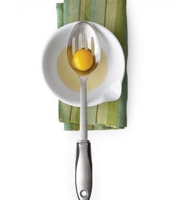 Vei observa ca in cateva secunde vei ramane cu galbenusul intact pe spatula, albusul scurgandu-se printre crapaturile accesoriului de bucatarie. Evident, ai face bine sa pui sub spatula un bol in care sa curga albusul.