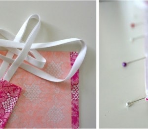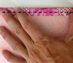 Pasul 2: Pe marginile de 43 cm lipeşte bandă bias albă ca în imagini şi prinde-o cu ace.