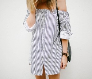 1. Trasează o linie de la un umăr la celălalt. Taie partea de sus a cămăşii pe lungimea liniei, apoi măsoară şi taie bucata de elastic de care ai nevoie pentru a crea partea de susţinere a rochiei.